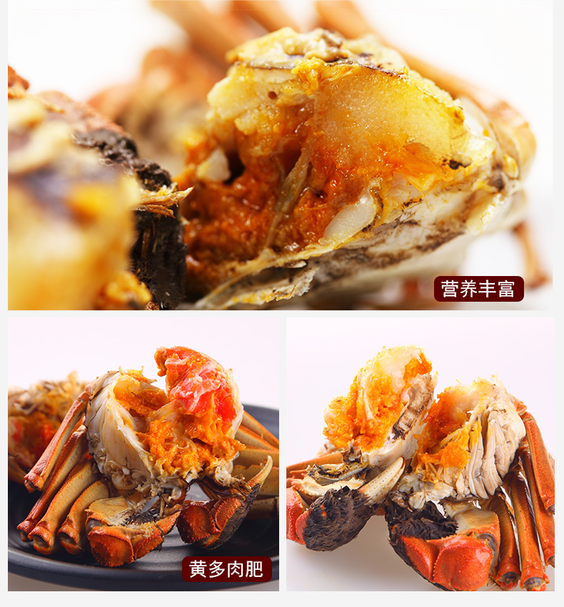 EM大閘蟹個(gè)大體肥,肉質(zhì)肥嫩鮮美,一般三只重500克,大者只重250克以上,最大者可達(dá)500克,青背白肚金爪黃毛,十肢矯健,蟹肉豐滿,營(yíng)養(yǎng)豐富。